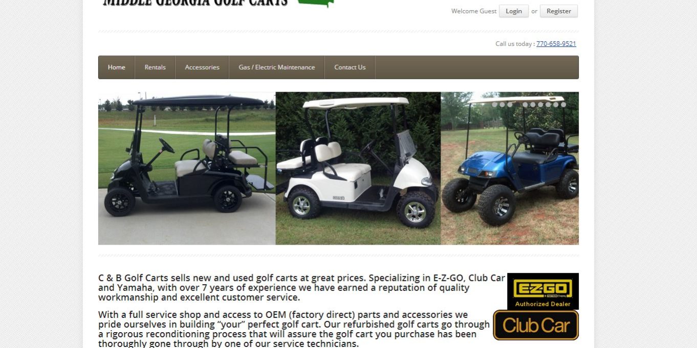 678PC created a custom wordpress theme for Carts and Barrels. The website lists carts and parts for sale, rental info, and contact information.